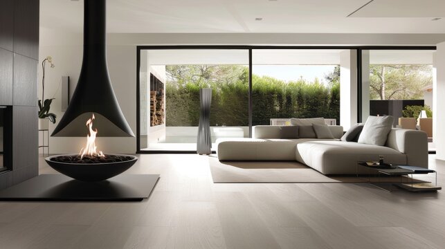 A black minimalist bioethanol fireplace blends seamlessly into the sleek and clean lines of this modern living space. 2d flat cartoon.