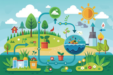 A colorful cartoon illustration depicting the nitrogen cycle in a lush environment with plants and water, Nitrogen cycle Customizable Cartoon Illustration
