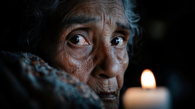 An elderly woman gazes poignantly into the camera, her face illuminated by candlelight, revealing her intricate features and evoking deep emotions about aging and wisdom.