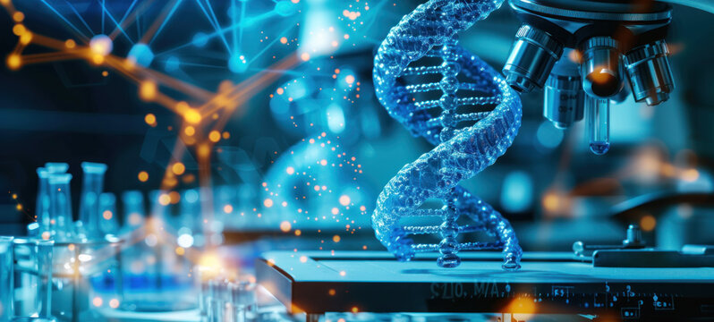 DNA double helix. DNA molecule structure. Medical science research of chromosome DNA genetic biotechnology in human genome cell. Science laboratory experiments analysis and genetic engineering study.