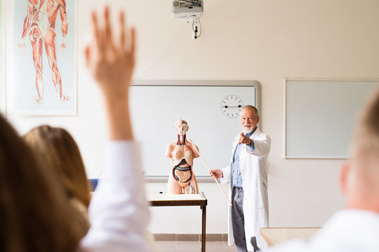 Senior teacher teaching biology to high school students.