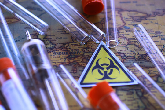 Ukrainian flag biohazard and test tubes. Assistance to Ukraine in biolaboratories. Western biological laboratories in Ukraine.