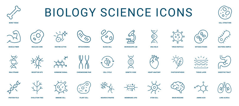 Laboratory science line icon set featuring vector pictograms of microscope, dna, bacteria, test tubes, petri dish, syringe, pipette, and flask in thin outline style.