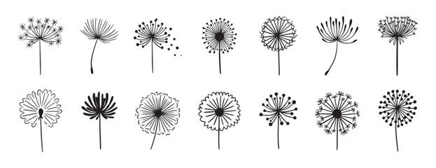 Dandelion flower silhouette doodle hand drawn icon set. Outline drawing Dandelion flower silhouette line clipart symbol collection