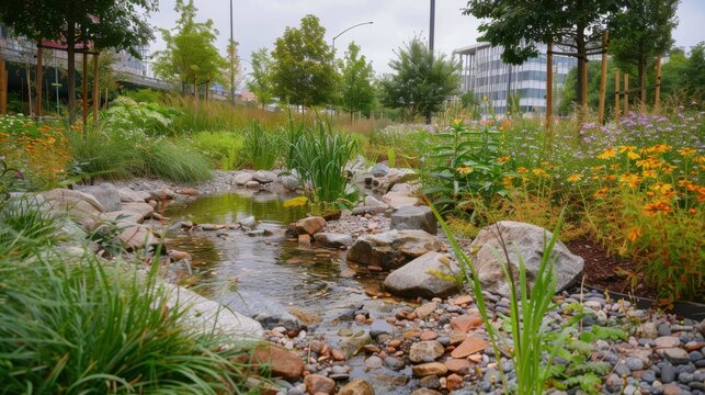 Bioswales in an urban park, managing stormwater naturally, front view, illustrating green infrastructure, cybernetic tone, Triadic Color Scheme
