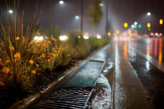 Efficient street water drainage system managing rainwater effectively. Concept Sustainable Drainage Systems, Stormwater Management, Urban Flooding, Green Infrastructure, Permeable Pavements