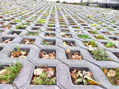 Patterns of nature in urban design showcasing greenery through hexagonal pavers and scattered leaves