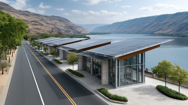 Panoramic coastal highway scene with roadside solar canopies over EV charging stations, landscaped bioswales capturing runoff, and wind-powered street fans cooling electric vehicles during eco-tourism