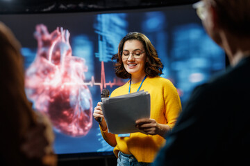 Female biotech entrepreneur presenting innovation at conference