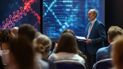 Scientist presenting new research about genetics and dna to audience