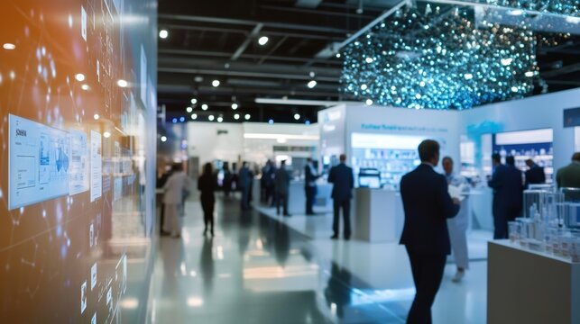 A modern pharmaceutical conference scene, featuring industry professionals and technological exhibits