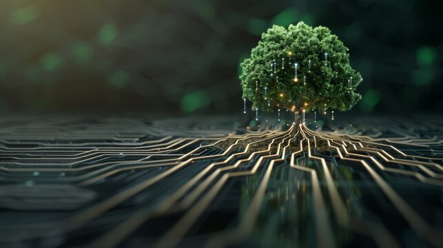 Conceptual image of technology and nature integration with a tree growing from a circuit board, symbolizing the synergy between biology and tech.