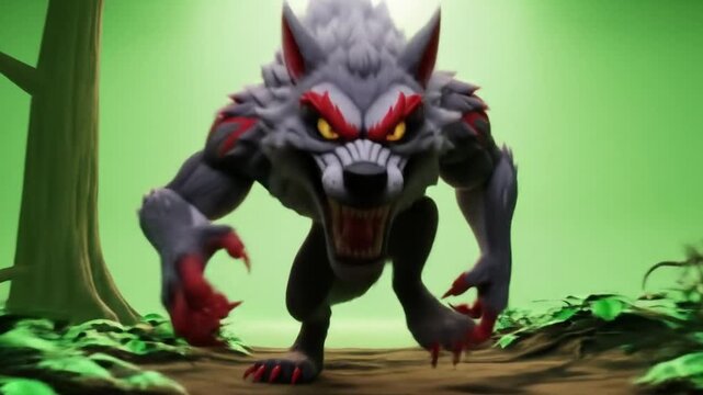 Fierce Animated Werewolf Monster Stalks and Attacks Toward Camera on Green Screen