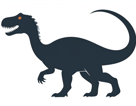 Silhouette of a dark blue bipedal dinosaur with orange eyes and visible teeth on white background