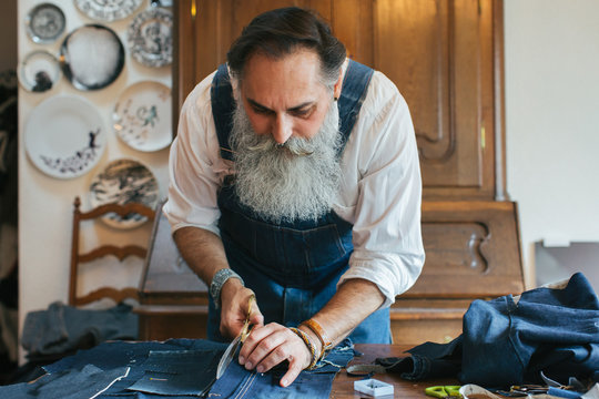 Environmental Portrait of Cool Senior Tailor With Grey Beard Working at Home