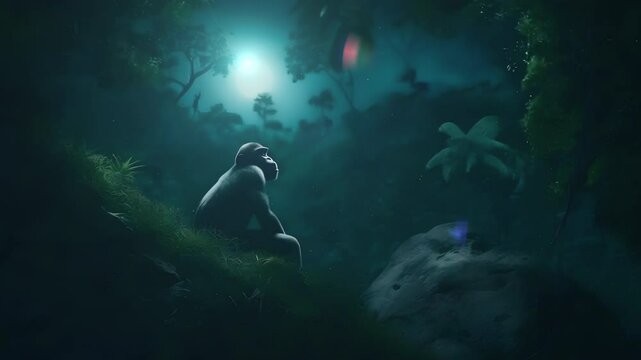 Video Recreation of a bipedal hominid sit down looking the stars at night in the jungle