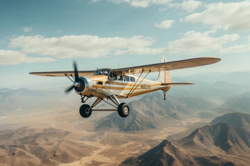 Generative AI illustration of classic biplane flying over rugged mountain terrain with a clear sky above