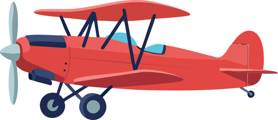 Red vintage biplane airplane side view vector illustration with propeller and open cockpit design