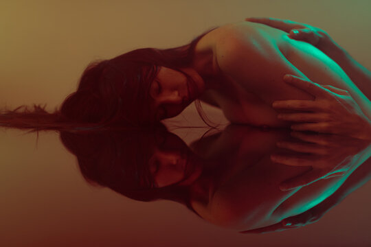 Reflected woman with hands holding her