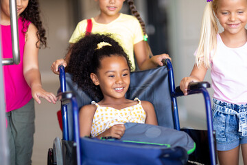 Disabled biracial child riding piggy back on his sister, family