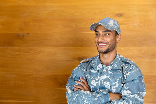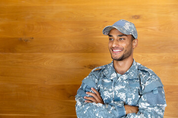 Portrait of happy biracial male soldier wearing military uniform and cap, looking at camera