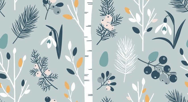 Seamless winter botanical pattern featuring snowdrops, pine needles, berries, and birch trees on a muted background.