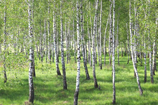 Beautiful birch trees with white birch bark in birch grove among other birch trees