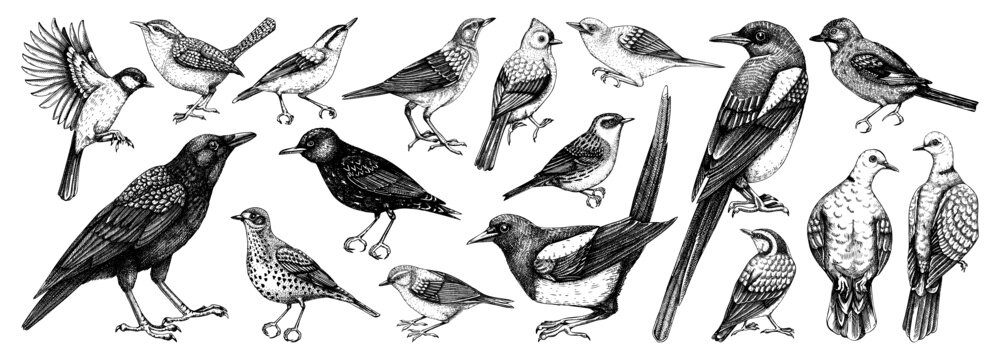 Garden Birds. Set. Vector vintage illustrations. Black and white