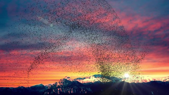 Large flock of birds flying in slow motion