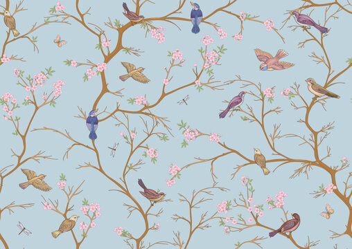 Mughal garden wallpaper with birds and peacock Watercolor background illustration for mural design with floral and tropical elements