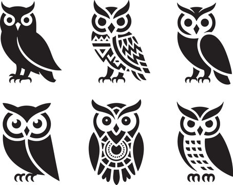 Collection of six black and white owl silhouettes with decorative designs and detailed features