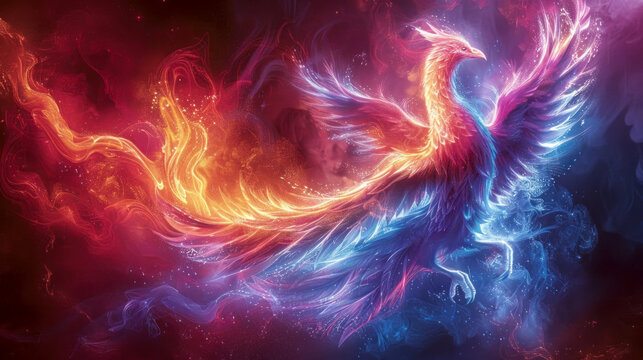 Magical fairy-tale rainbow shining phoenix bird in flight