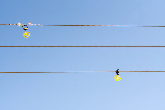 bird protection devices or bird diverters hang on wire cables or electric power lines for safety measures to protect birds flying into them concept environmental protection of wildlife