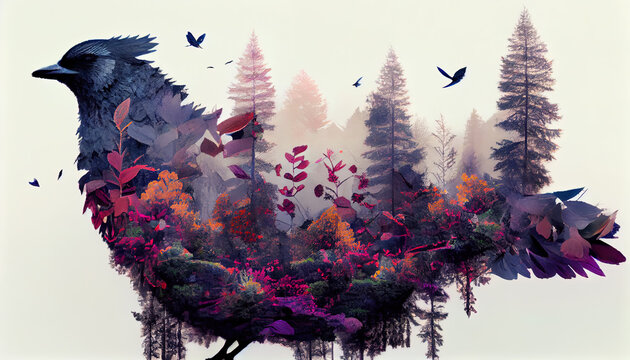 double exposure effect, colorful birds againts the flowers, trees, and blossoms of spring, ai generated, digital art