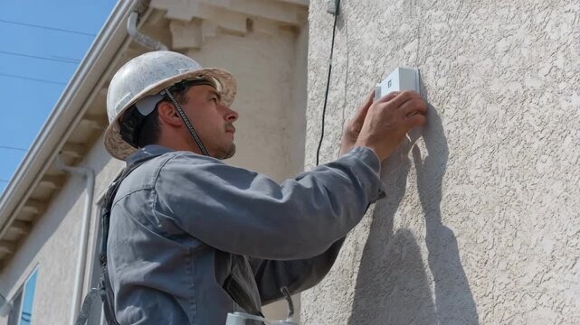 Technician mounts soundemitting devices on exterior wall to repel birds using ultrasonic frequencies in a residential setting.