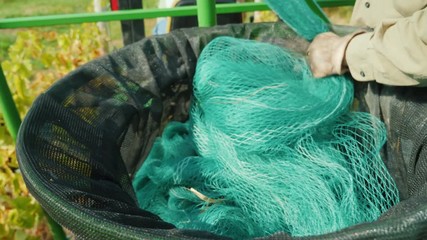 Hands of the farmer in gloves, laying the protective net in a barrel. Vineyard protection from birds