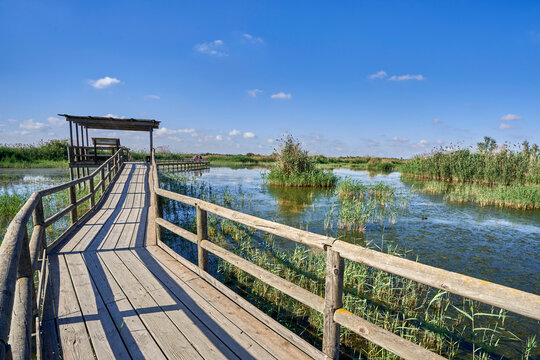 Wooden walkway in the the Hondo of Elche natural park. In Elche, Alicante, Valencian community, spain.