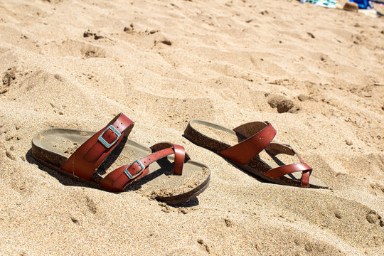 brown worn out leather sandals lean on wooden box outside