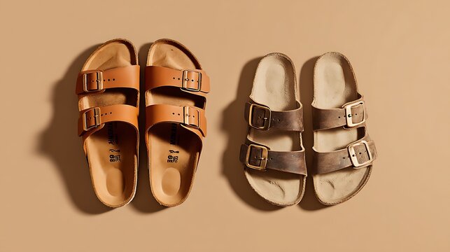 Two pairs of stylish birkenstock sandals, one in tan leather and the other in gray, are arranged on a neutral background, showcasing footwear fashion