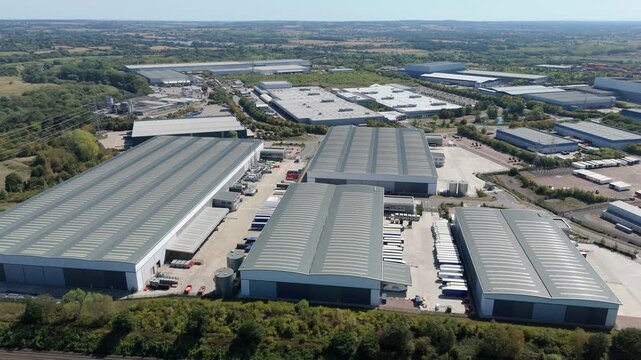 Aerial drone top down view of industrial warehouses and distribution centres, business park, near Birmingham england UK