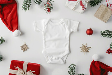 White baby onesie surrounded by Christmas decorations, holiday baby pregnancy announcement mockup
