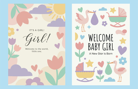 Set of baby shower invitation with cartoon baby girl, baby boy, rocket and hot air balloon on blue and pink background. It's a boy. It's a girl. Vector illustration