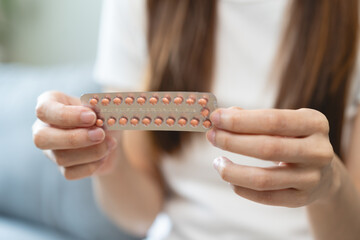 Oral contraceptive pill on pharmacy counter with colorful pills strips background.