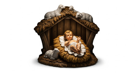 Manger with baby, hay and stones on dark table