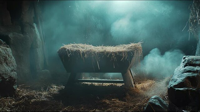 A rustic wooden manger filled with straw in a dimly lit stable, evoking themes of Christmas, birth, and biblical history.