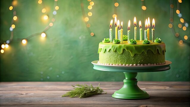 Delicious Green birthday cake with candles on a green background with balloons and space for text