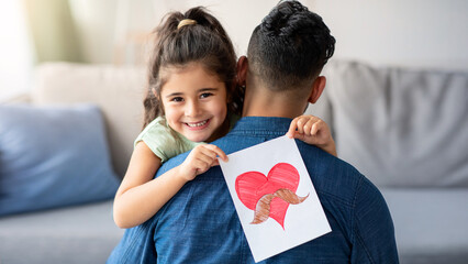 Photo of little pretty funny lady her handsome daddy sit cozy sofa hugging hold cute card birthday present reading greeting celebrate words best holiday house room indoors