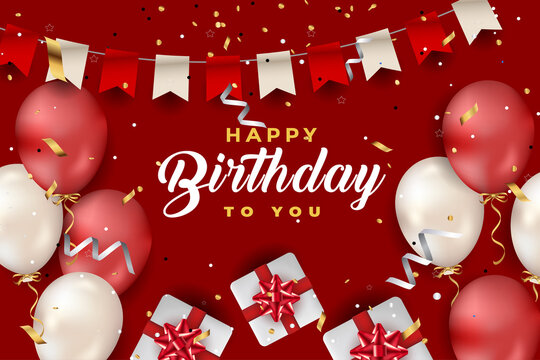 Happy birthday card background, gift box with balloons and golden ribbon around, 3d style luxury backdrop, modern template invitation design. realistic vector illustration.