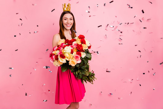 Portrait of her she nice-looking attractive cheerful cheery glad girl holding in hands big large bouquet from boyfriend wearing crown isolated on pink pastel color background