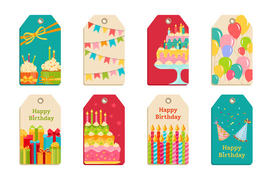 Birthday party tags set sticker. Cartoon label present cake, candle, gift box, cupcake. Colorful balloons, flat celebration food, candy. Party design elements, balloon, sweet, dessert. Isolated vector